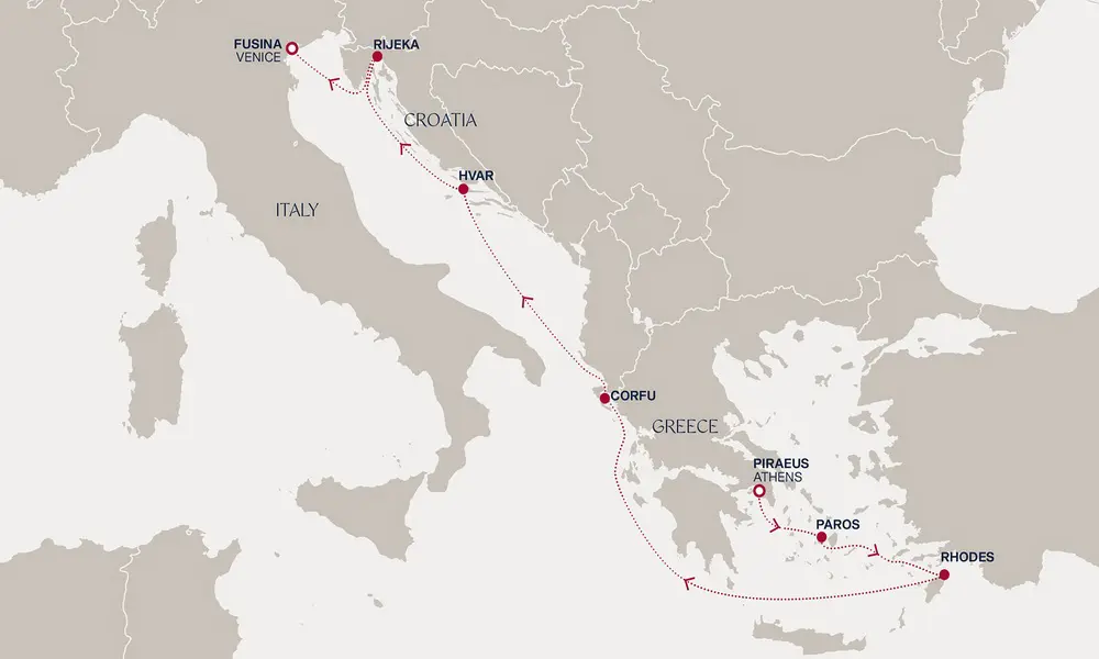 Krećemo iz Atine, večnog grada u kome antički hramovi stoje uz moderne avenije. Na Parosu vas dočekuju zlatne plaže i tirkizno more, dok Rodos priča priče o vitezovima i mitovima. Krf očarava mirisom maslinjaka, a Hvar lavandinim poljima i kristalno čistim uvalama. Rijeka otkriva trgove i bogatu arhitekturu, a završetak u Veneciji donosi bajkovitu sliku gondola, kanala i istorijskih palata.