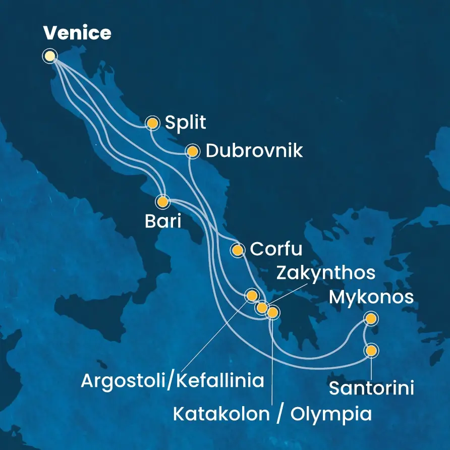 Opcija 15-dnevnog krstarenja iz Venecije, sa kombinacijom dva letnja itinerera