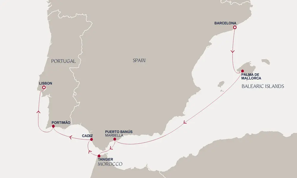 Otplovite iz užurbane Barselone do noćnim životom bogatih obala Ibize. Produžite sa sjajem i glamurom do Marbelje pre nego što pređete u marokanski žar Tangera. U Kadisu otkrijte drevnu istoriju u jednom od najstarijih gradova Evrope. Zatim, dopustite da vas fado muzika očara u opojnom Lisabonu.