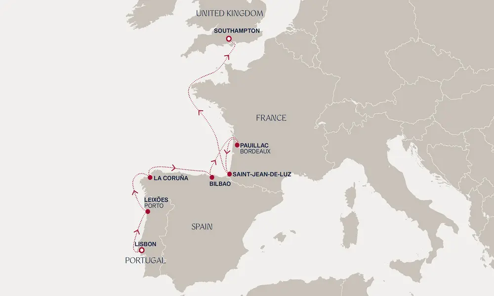 Lirični Lisabon postupno prelazi u slavna vina i istorijski šarm Porta, pre nego što uživate u pogledima na Galiciju. Povežite se sa umetnošću, arhitekturom i bogatom baskijskom kulturom Bilbaa, zatim otplovite do svetski poznatih vinograda Bordoa i Sen-Žan-de-Luza. Uživajte u danu na moru, ploveći u živahni zagrljaj Sotemptona.