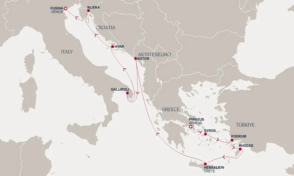 Iz Atine krećemo ka neoklasičnom Syrosu i Bodrumu, gde se tirkizno more i istorija prepliću. Rodos nas uvodi u srednjovekovne zidine, a Heraklion u minoanske legende. Na brodu uživamo u luksuzu i miru dok plovimo ka Kotorskom zalivu, potom do Zlatne obale Galipolija, šarmantnog Hvara i veličanstvene Rijeke. Venecija nas dočekuje šarenim gondolama i bezvremenom lepotom.