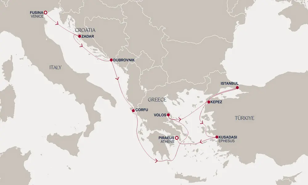 Od zlatnih kanala Venecije do rimskih ostataka Zadra, potom do Dubrovnika pod moćnim zidinama. Krf nas dočekuje maslinjacima i mirisom mora, a Volos poziva u priče sa Olimpa. Noćenje u Istanbulu otkriva njegovu nesvakidašnju energiju, dok Kepez vodi ka legendama Troje. Efez nas vraća u antičko doba, a Atina zaokružuje ovu epsku rutu.