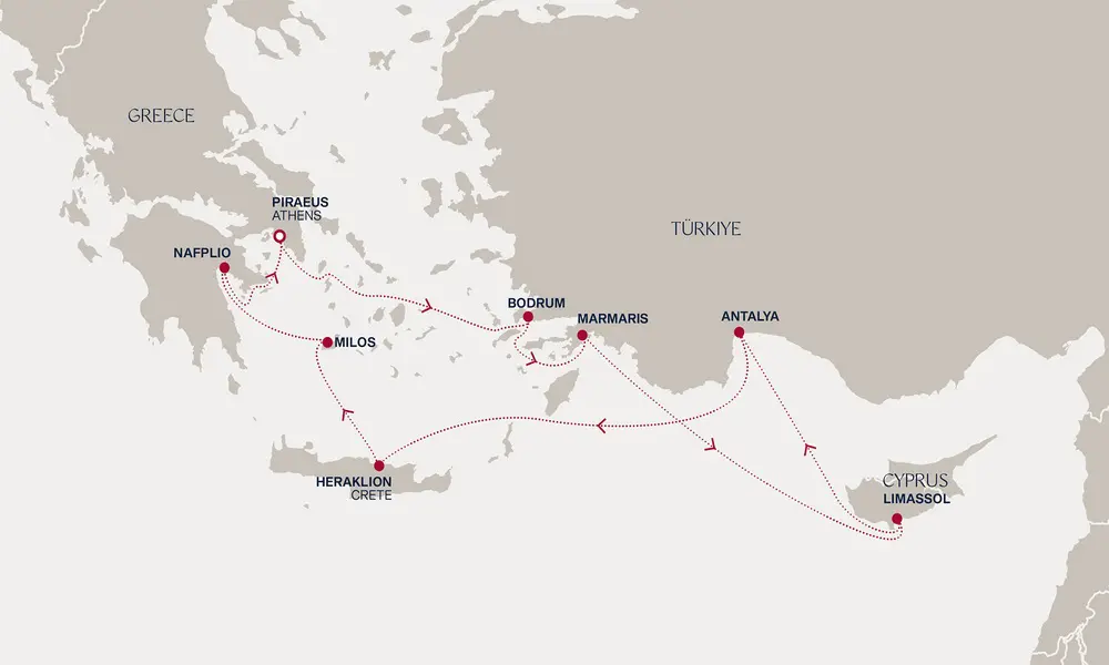 Iz Atine plovimo ka Bodrumu i njegovim belim kućicama uz miris mora, zatim Marmarisu i njegovim živopisnim bazarima. Limassol nas vodi u srednjovekovne priče, a Antalya nudi panorame koje oduzimaju dah. Heraklion otkriva minoansku prošlost, Milos tirkizne uvale i bele stene, a Nafplio romantične trgove i neoklasičnu eleganciju. Povratak u Atinu donosi novi susret s njenim legendama.