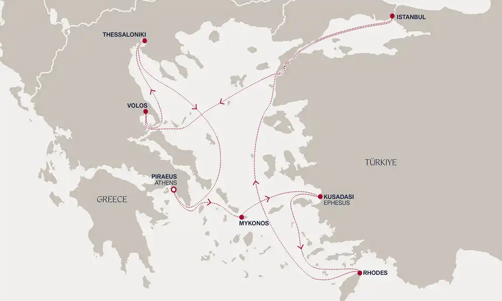 Iz živopisne Atine plovimo ka Mykonosu i njegovoj cikladskoj lepoti, pa u Kušadasi istražujemo čuveni Efez. Rodos nas očarava legendama i istorijom, a noćenje u Istanbulu pruža spoj kultura i mirisa. Volos nas vodi u mitove Peliona, a Solun u spoj vizantijskog nasleđa i modernog duha. Povratak u Atinu vraća nas korenima civilizacije.
