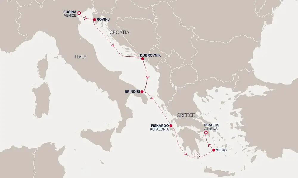 Venecija nas pozdravlja gondolama i palatama, a Rovinj mirisima Istre. Dubrovnik nas vraća u srednji vek, Brindizi otkriva obalu Apulije, a Fiskardo spokoj grčkog ostrva. Milos nas očarava belim liticama, a Atina zaokružuje putovanje spojem drevnog i modernog.