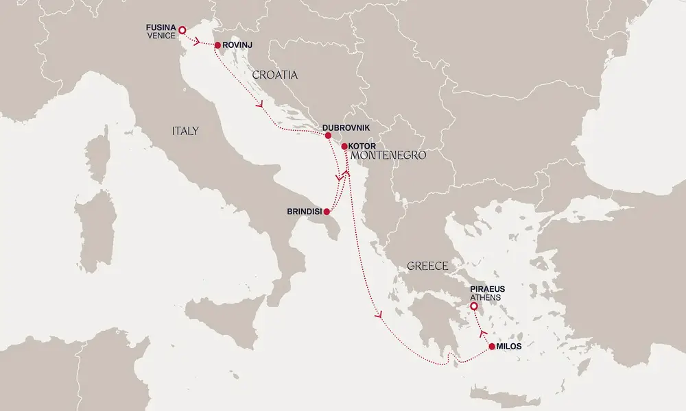 Venecija nas pozdravlja elegancijom, a Rovinj svojim šarenim fasadama. Dubrovnik otkriva veličanstvene zidine, Brindizi meša duh Rima i miris mora, a Boka Kotorska očarava bajkovitim zalivom. Nakon dana uživanja na brodu, Milos nas osvaja belim stenama i tirkiznim morem, a Atina dočekuje energijom i nasleđem koje traje vekovima.