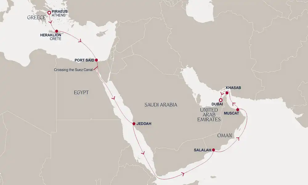 Atina nas ispraća antičkim blagom, a Heraklion minoanskim mitovima. Port Said otvara vrata Sueckog kanala, dok noćenje u Džedi otkriva raskoš Crvenog mora i arapske tradicije. Plovimo ka mirisnim obalama Salale i veličanstvenim džamijama Muskata. Fjordovi Khasaba nude prizore netaknute prirode, a završetak u Dubaiju otkriva grad budućnosti pod zracima pustinčkog sunca.